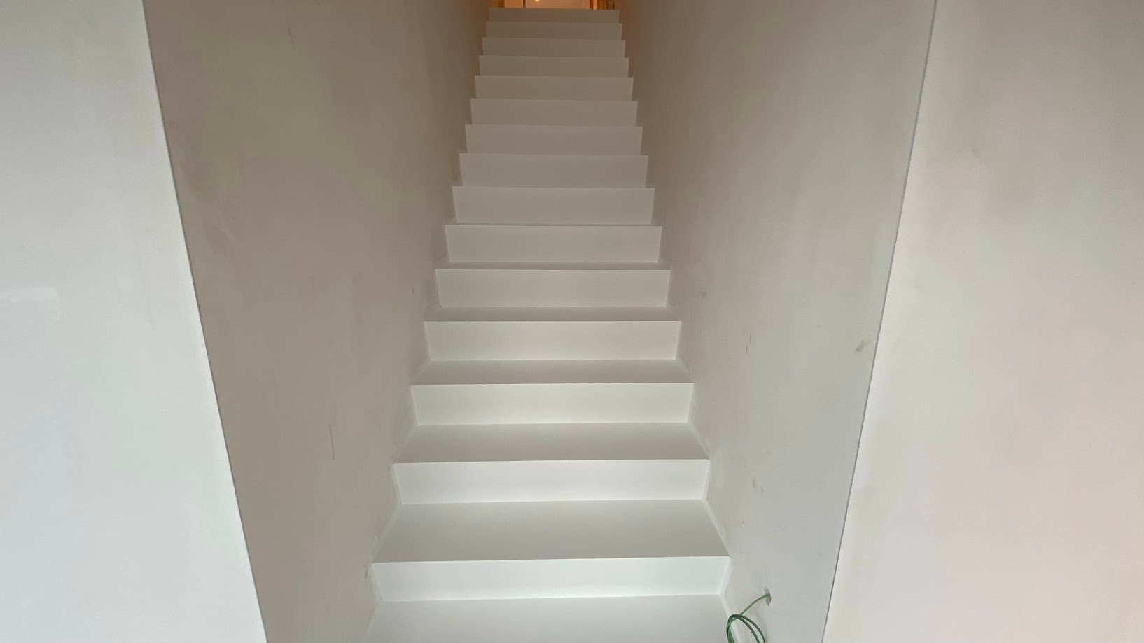 Een pu gietvloer in betonlook wordt ambachtelijk geplaatst waardoor deze afwerking een uniek karakter krijgt. Op de bovenverdieping werd voor een uni-kleur geopteerd.