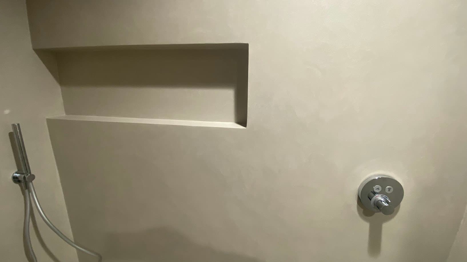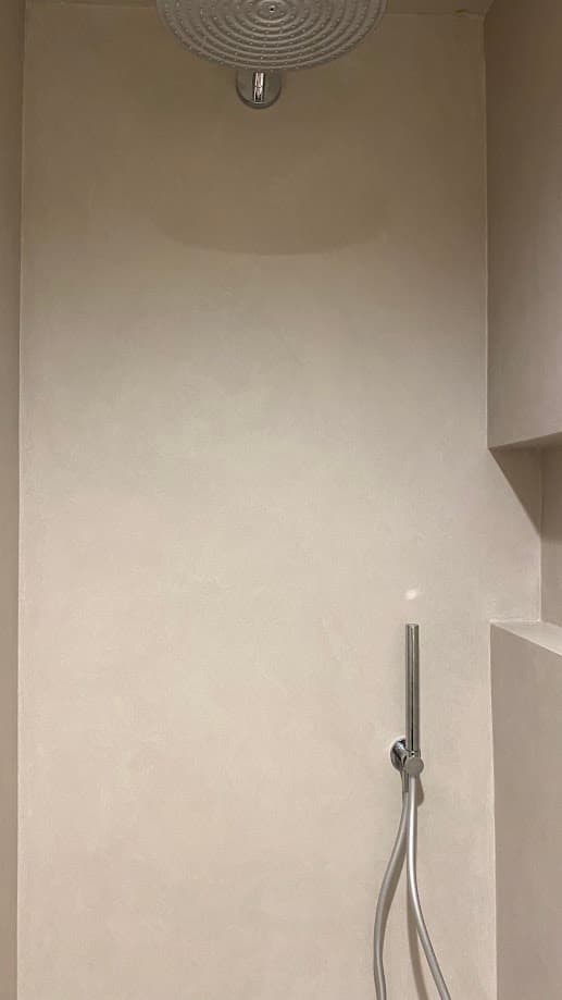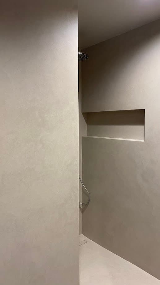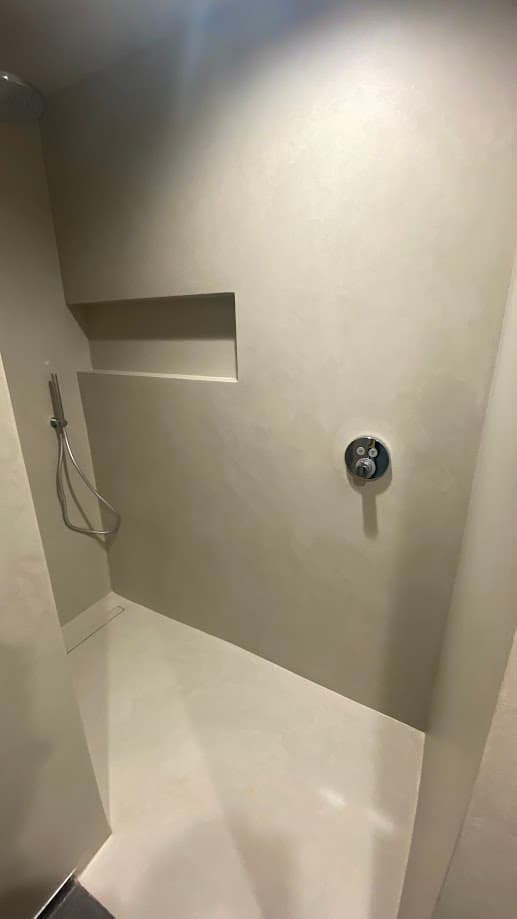 Verken deze douchecel, waar zowel de vloer als de muren zijn omhuld met een high-end microcement Forcrete. Dit geeft een warm gevoel en een natuurlijke betonlook uitstraling. Geniet van de naadloze elegantie van deze prachtige afwerking met minerale look.