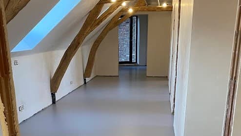 Een prachtige PU gietvloer in betonlook met unikleur op het gelijkvloers en bovenverdieping in Galmaarden.