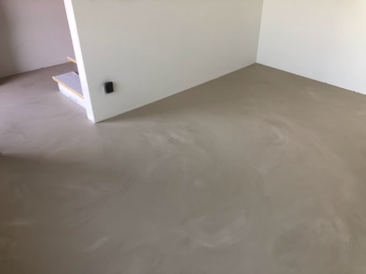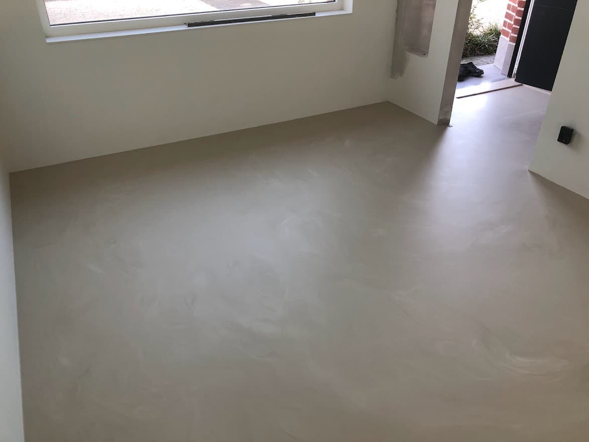 Een moderne betonlook PU gietvloer in een woning in Izegem.