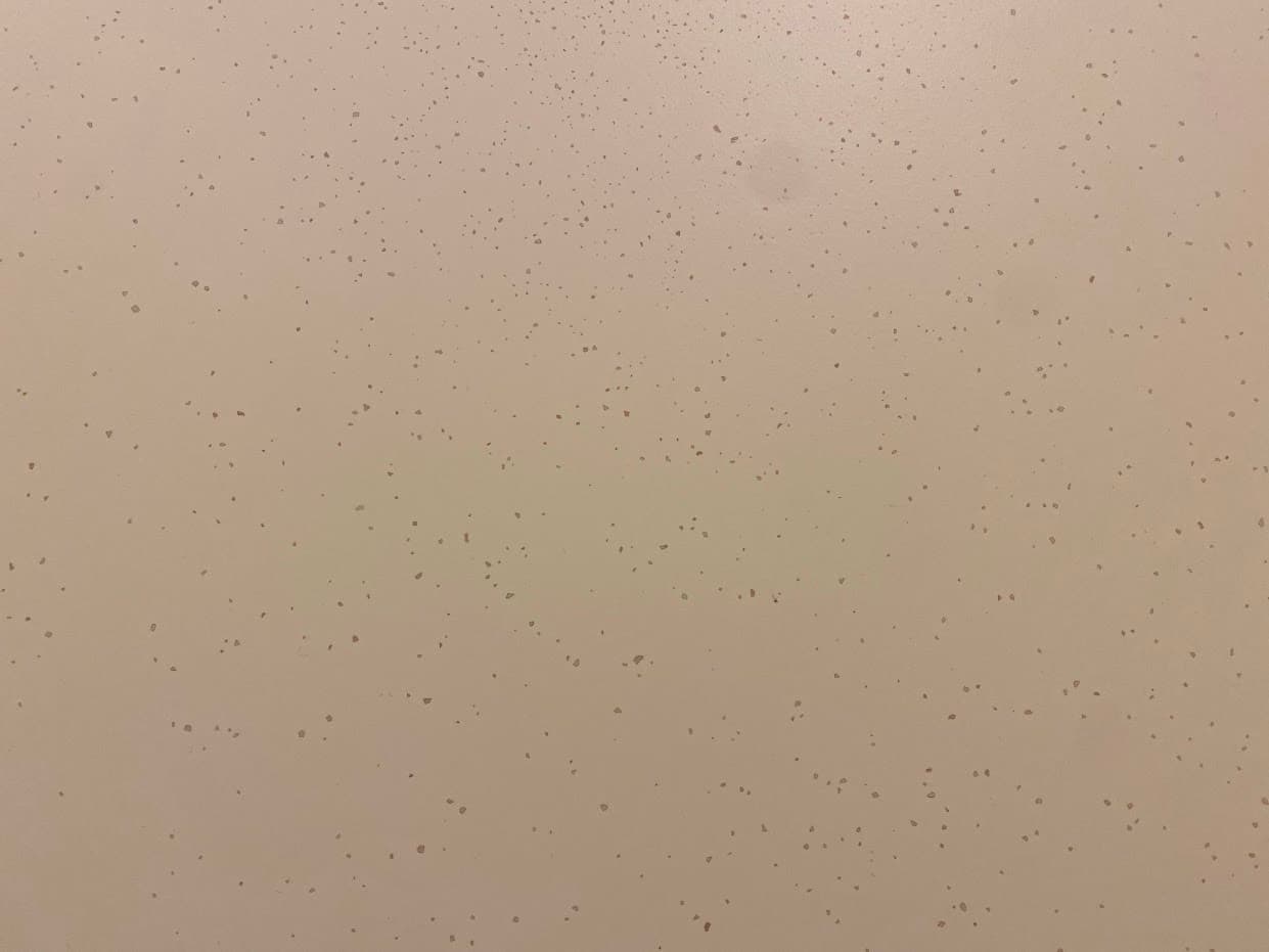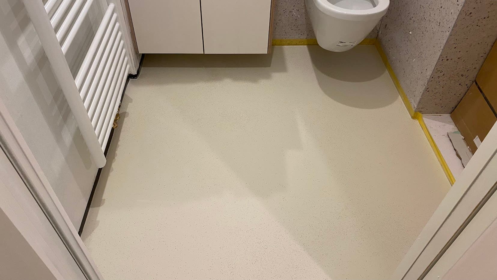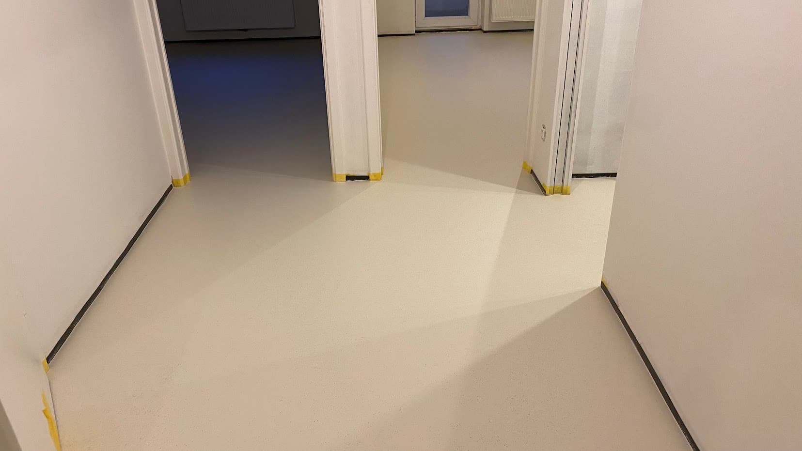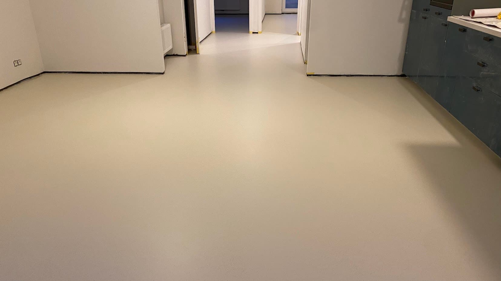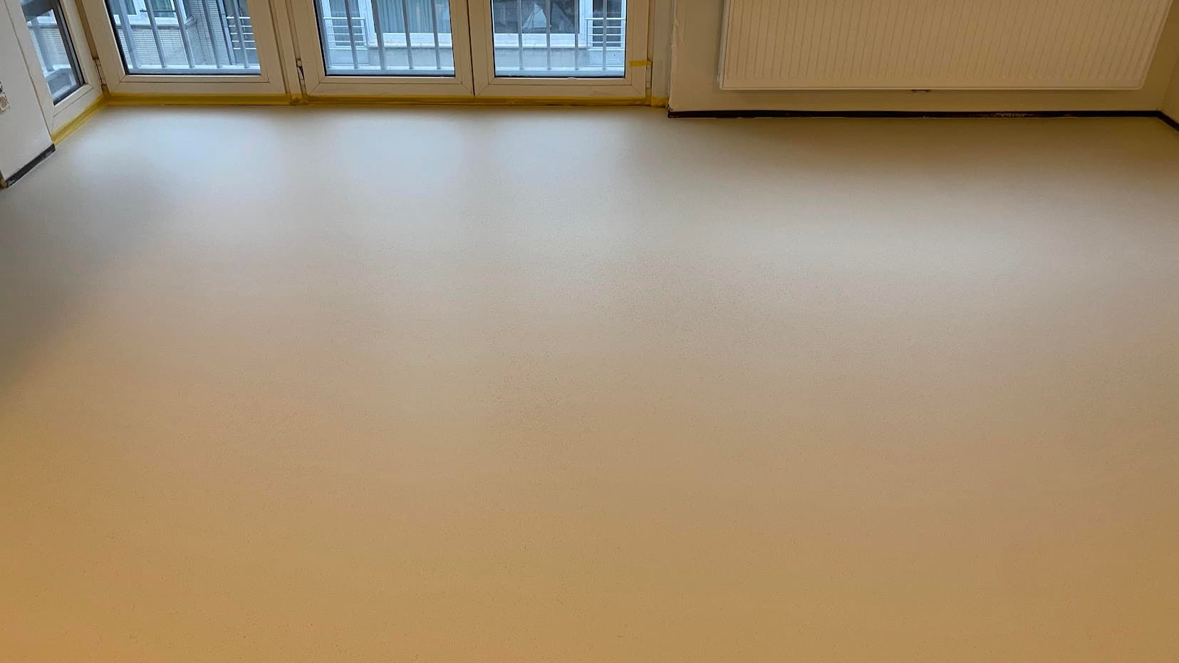 Deze zachte gietvloer met flakes voegt een speels tintje toe aan de vloer, waardoor het appartement een unieke uitstraling krijgt. De toegevoegde transparante glasparels versterken de vloer en verminderen slijtage (zand!)